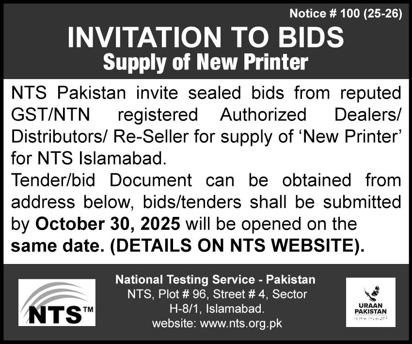 National Testing Service - Pakistan (Invitation To Bids Supply of New Printer)