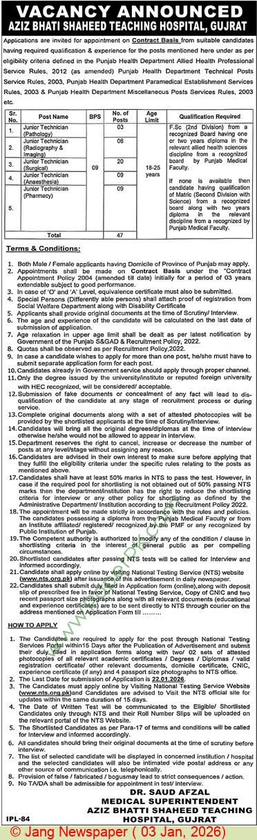 Aziz Bhatti Shaheed Teaching Hospital Gujrat - Vacant Position (Specialized Healthcare & Medical Education Department)