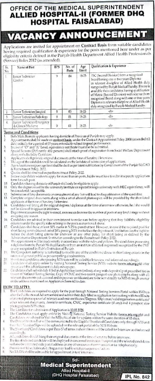 Allied Hospital-II Former DHQ Hospital Faisalabad - Vacant Position (Specialized Healthcare & Medical Education Department)