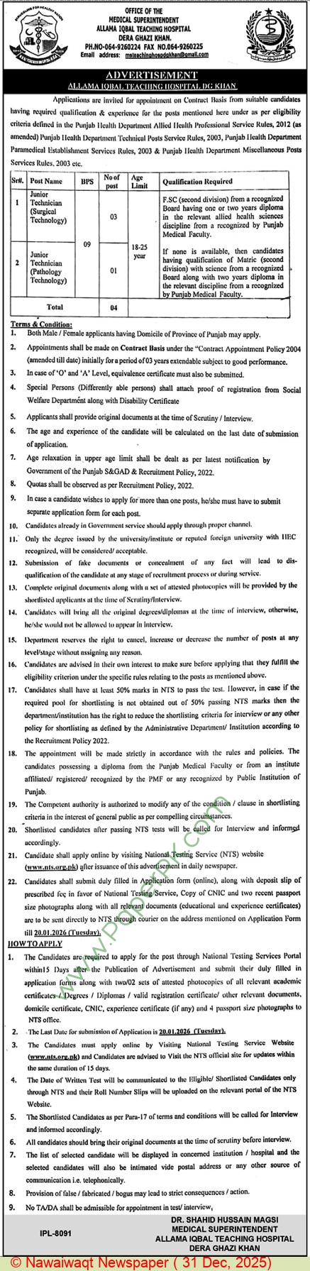 Allama Iqbal Teaching Hospital Dera Ghazi Khan - Vacant Position (Specialized Healthcare & Medical Education Department)