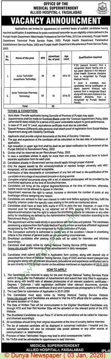 Allied-I Hospital, Faisalabad - Vacant Position (Specialized Healthcare & Medical Education Department)
