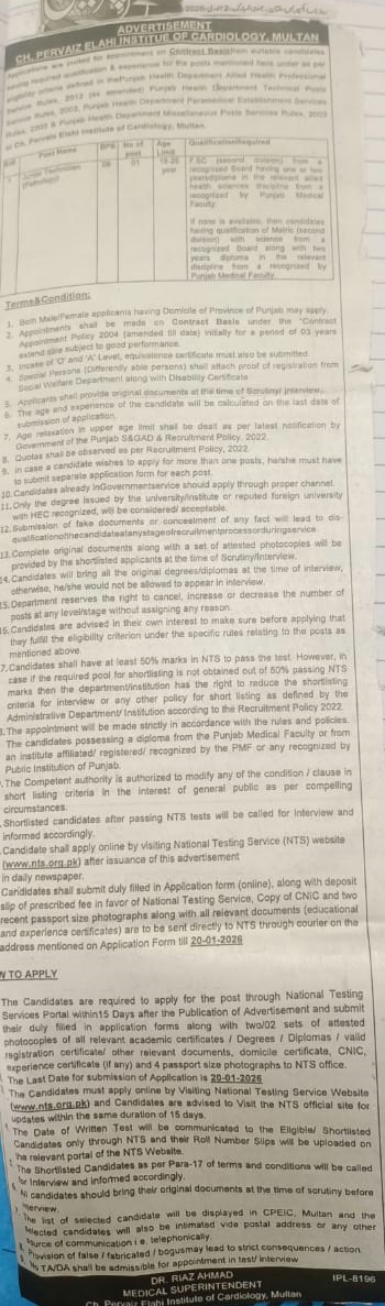 Chaudhary Pervaiz Elahi Institute Of Cardiology Multan - Vacant Position (Specialized Healthcare & Medical Education Department)