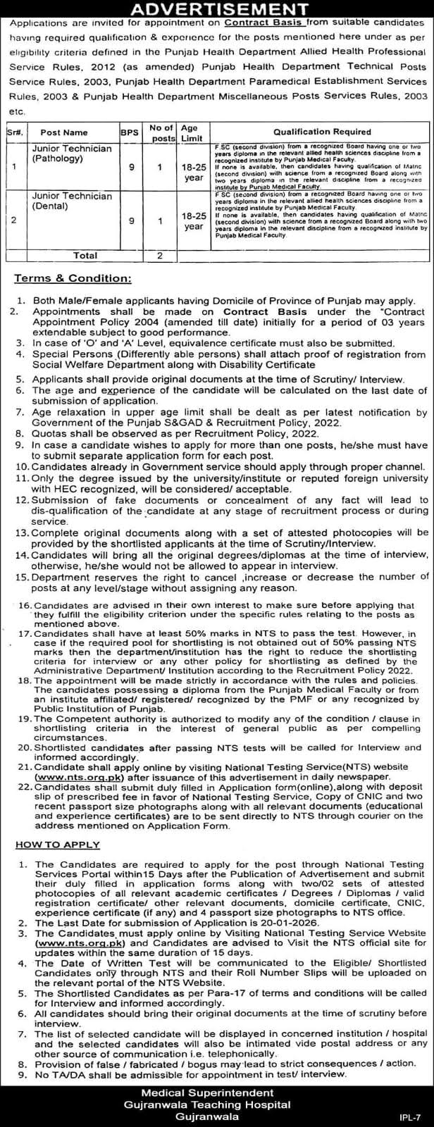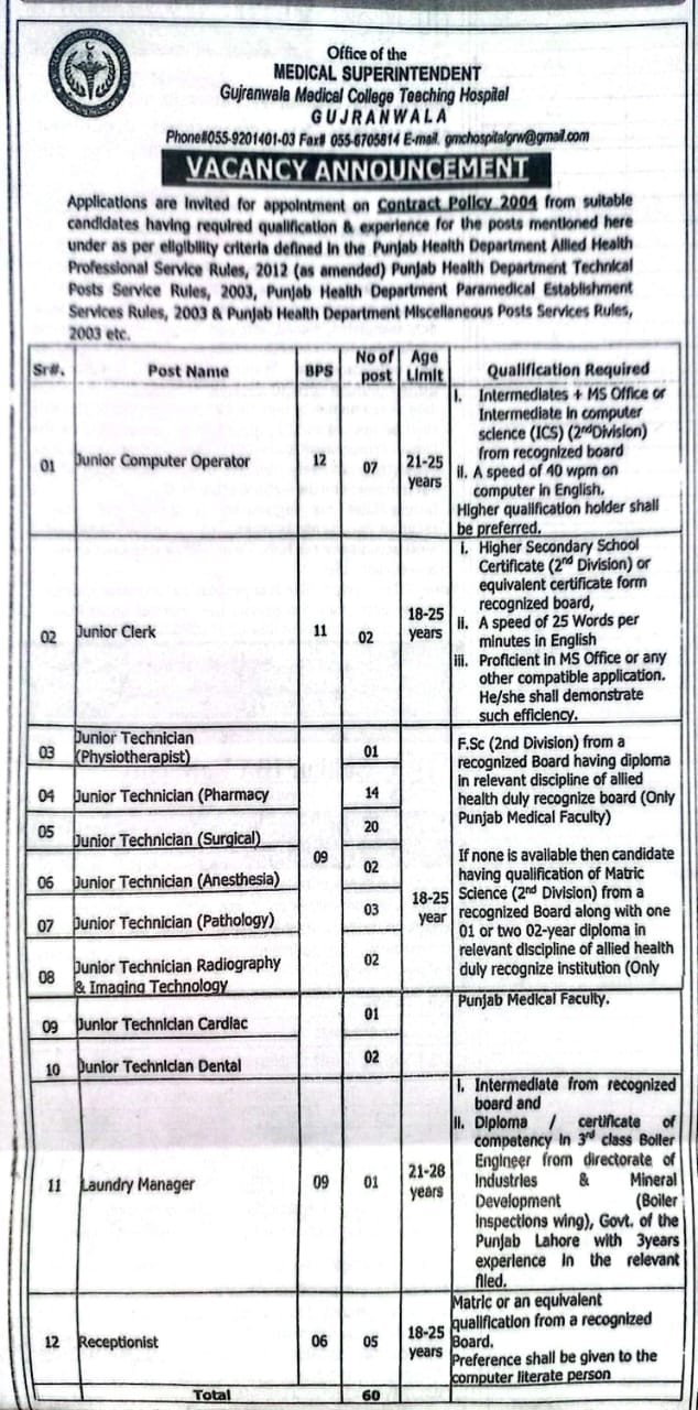 Gujranwala Teaching Hospital Gujranwala - Vacant Position (Specialized Healthcare & Medical Education Department)