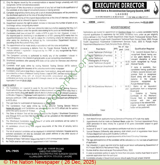 Jinnah Burn & Reconstructive Surgery Centre Lahore - Vacant Position (Specialized Healthcare & Medical Education Department)