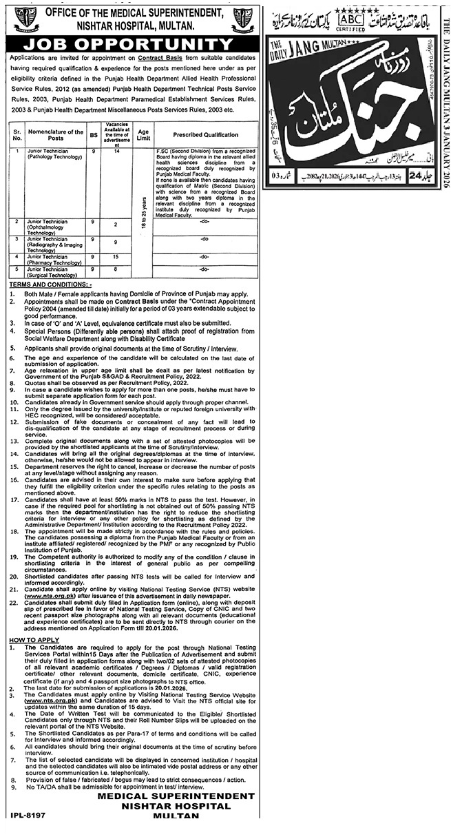 Institute of Ophthalmology & Allied Health Sciences, Nishtar Medical College Multan, - Vacant Position (Specialized Healthcare & Medical Education Department)