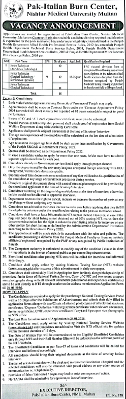 Pak Italian Burn Center Nishtar Medical University Multan - Vacant Position (Specialized Healthcare & Medical Education Department)