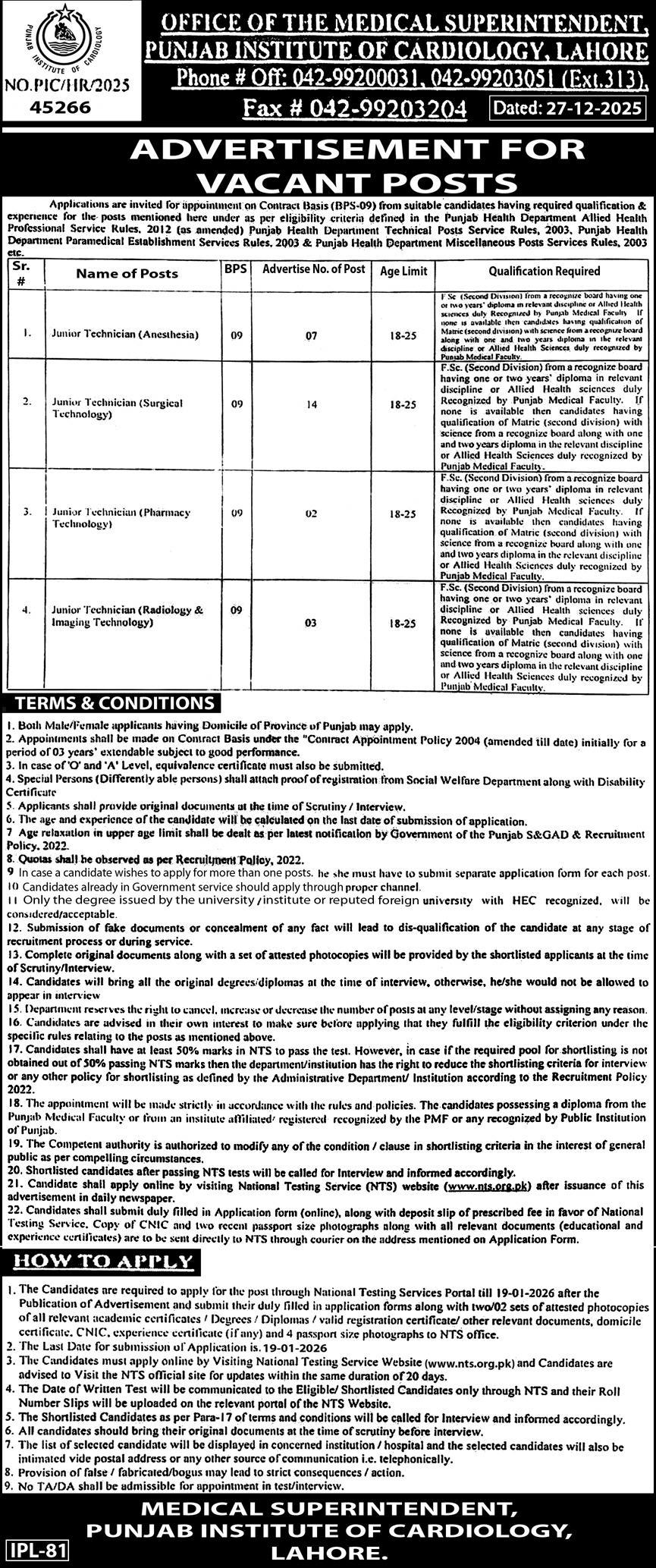 Punjab Institute of Cardiology Lahore - Vacant Position (Specialized Healthcare & Medical Education Department)