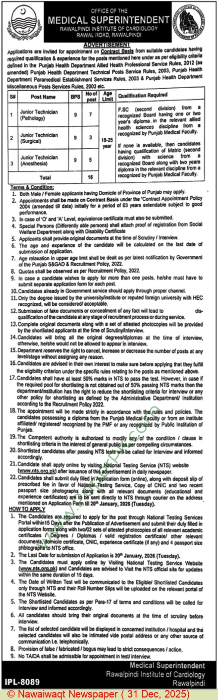 Rawalpindi Institute of Cardiology - Vacant Position (Specialized Healthcare & Medical Education Department)