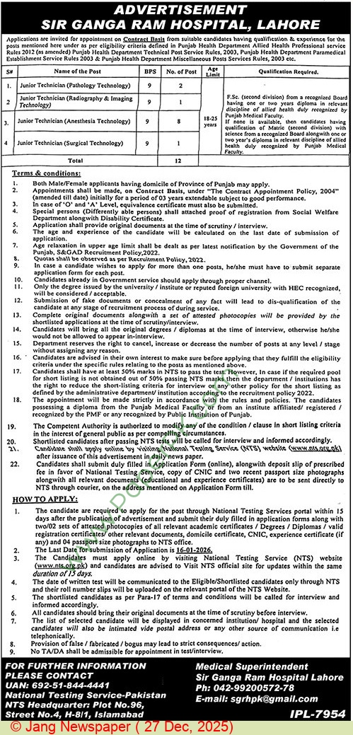Sir Ganga Ram Hospital Lahore - Vacant Position (Specialized Healthcare & Medical Education Department)