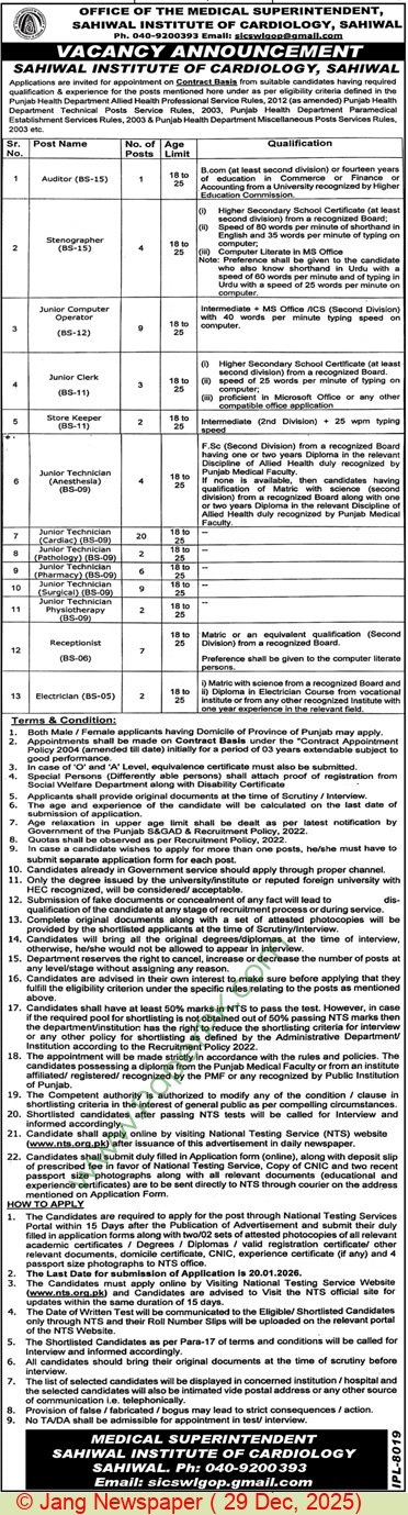 Sahiwal Institute of Cardiology - Vacant Position (Specialized Healthcare & Medical Education Department)