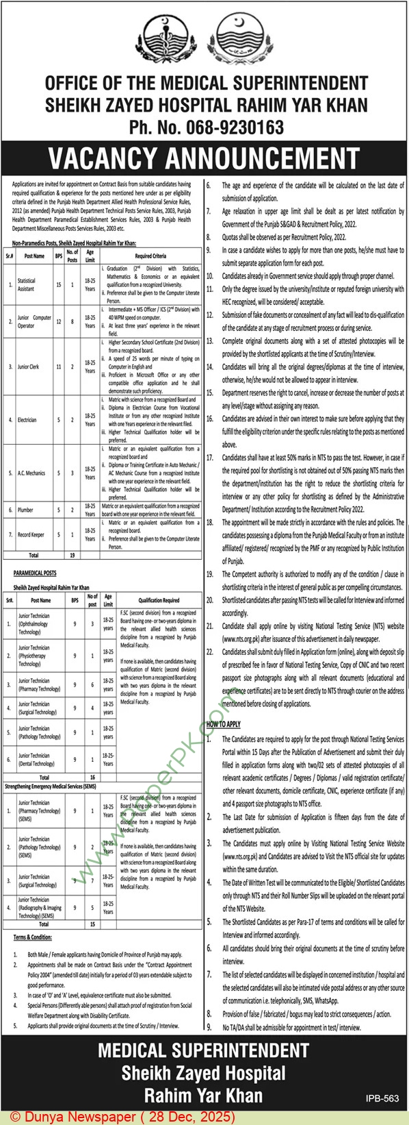 Sheikh Zayed Hospital Rahim Yar Khan - Vacant Position (Specialized Healthcare & Medical Education Department)