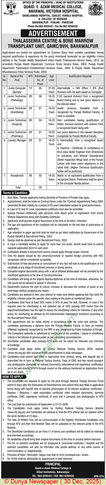Quaid e Azam Medical College & Allied Institutions Bahawalpur - Vacant Position (Specialized Healthcare & Medical Education Department)