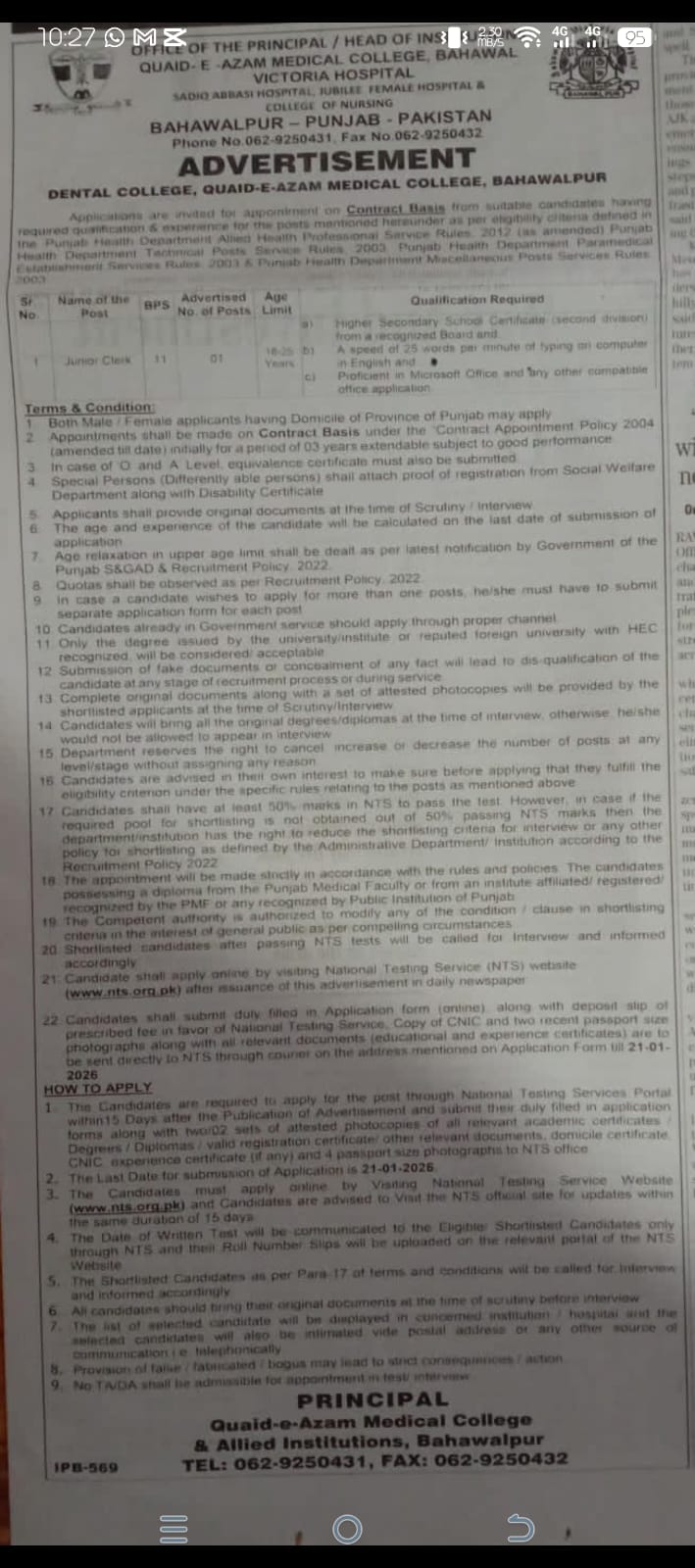 Quaid e azam Medical College & Allied Institutions Bahawalpur - Vacant Position (Specialized Healthcare & Medical Education Department)