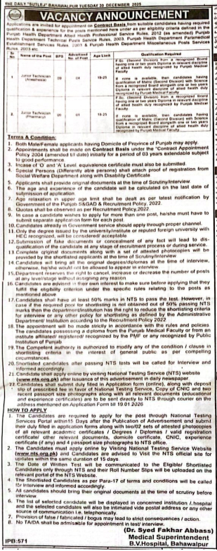 Quaid e azam Medical College & Allied Institutions Bahawalpur - Vacant Position (Specialized Healthcare & Medical Education Department)