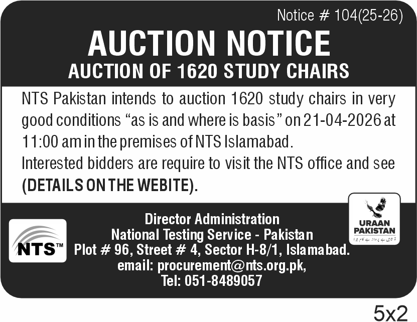 National Testing Service - Pakistan AUCTION OF 1620 STUDY CHAIRS