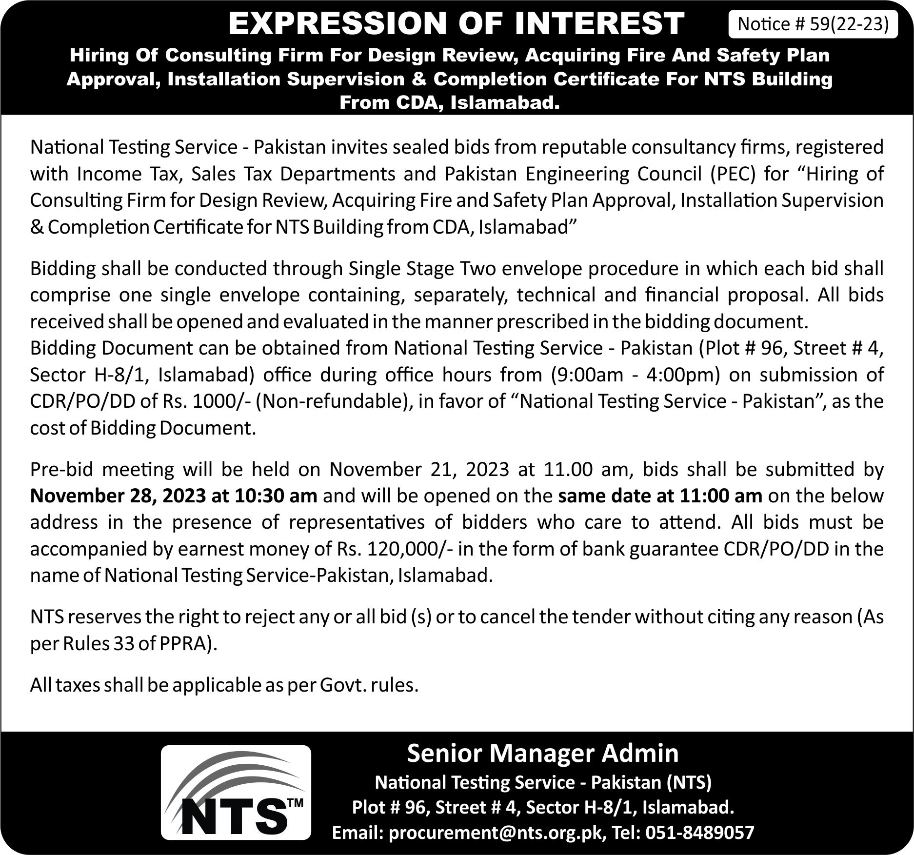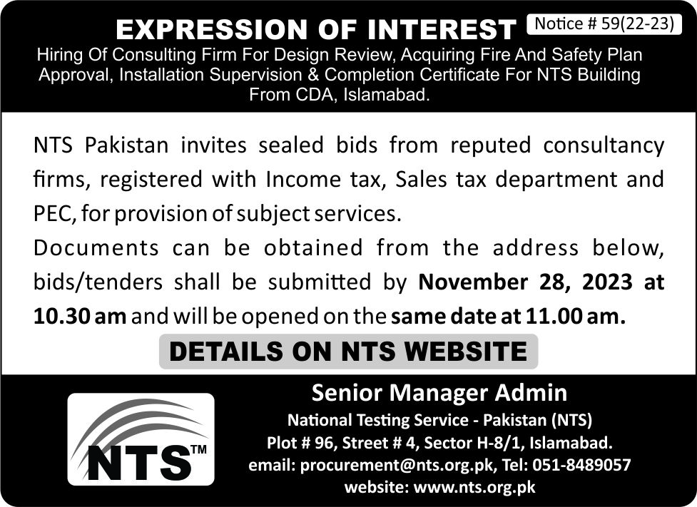 National Testing Service - Pakistan (Hiring Of Consulting Firm For Design Review, Acquiring & Safety Plan Approval, Installation Supervision & Completion Certificate For NTS Building From CDA, Islamabad)