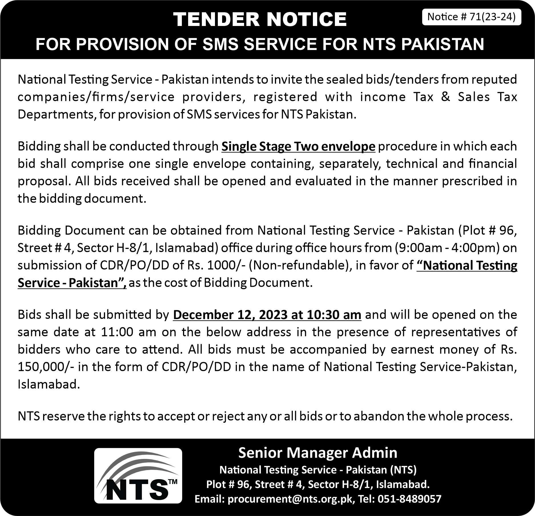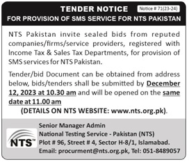 National Testing Service - Pakistan (For Provision of SMS Service For NTS Pakistan)