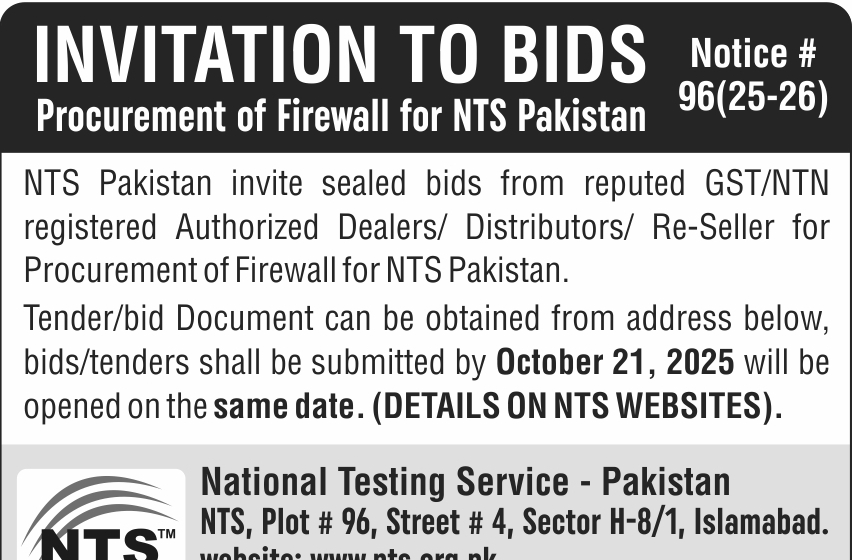 National Testing Service - Pakistan (Invitation to Bids Procurement of Firewall for NTS Pakistan)
